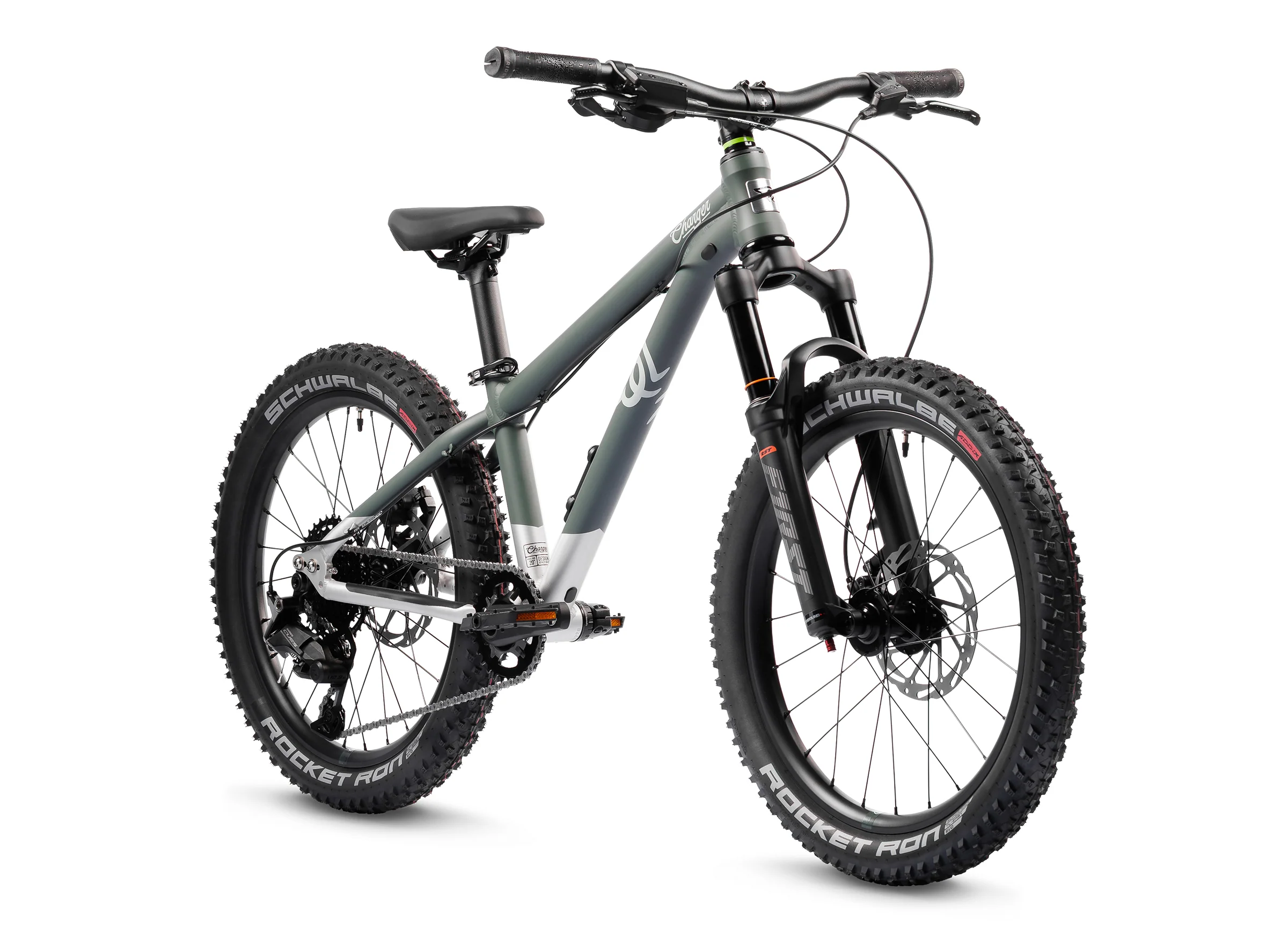 The Charger 20 is a premium 20" hardtail bike built for young riders aged 6–8 who are ready to push their trail riding further. Equipped with 100mm RST F1RST air suspension forks and a lightweight, trail-optimized frame that is dropper post ready. The Charger 20 offers outstanding control, comfort, and confidence on rough terrain. Sealed bearing wheels with bolt-thru axles deliver strength and smooth, consistent rolling, while wide Schwalbe Rocket Ron 2.25" tires ensure superior grip across mixed surfaces.  The refined chain-driven drivetrain features a new 110mm chainset and a Shimano CUES 9 Speed drivetrain for improved pedal efficiency. Making the Charger 20 the perfect choice for ambitious young trail riders.